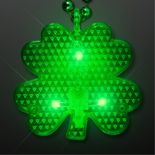 Flashing LED Shamrock Charm on Beads Necklace is another in our amazing arsenal of brilliant St. Patrick's Day Promos! Hard plastic green shamrock pendants flash bright, perfect for bar hoppin' on St. Patty's Day. To activate your Shamrock Charm, press the button to scroll through 3 light functions: Scrolling flash, all lights flashing, steady light. Complies with ASTM, CPSIA, Prop 65. 30" L x 2.5" W x 2.7" H