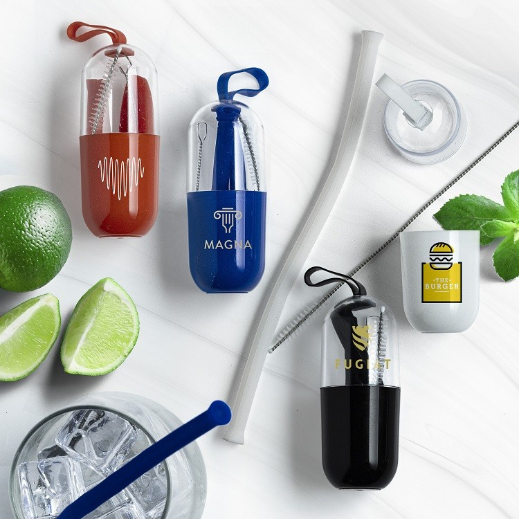 The perfect eco-gift for travelers on the go! This handy Silicone Straw Kit comes with a travel case in your choice of black, blue, red, and white with a matching straw and a screw-on lid and bottom. The silicone straw is 8 inches long, 7/16 wide at the top and bottom, and conveniently flexible, so you don't have to worry about chipping a tooth. It comes with a straw cleaner brush to keep clean between use. Complies with Prop 65. 1.25" W x 3.5" L.